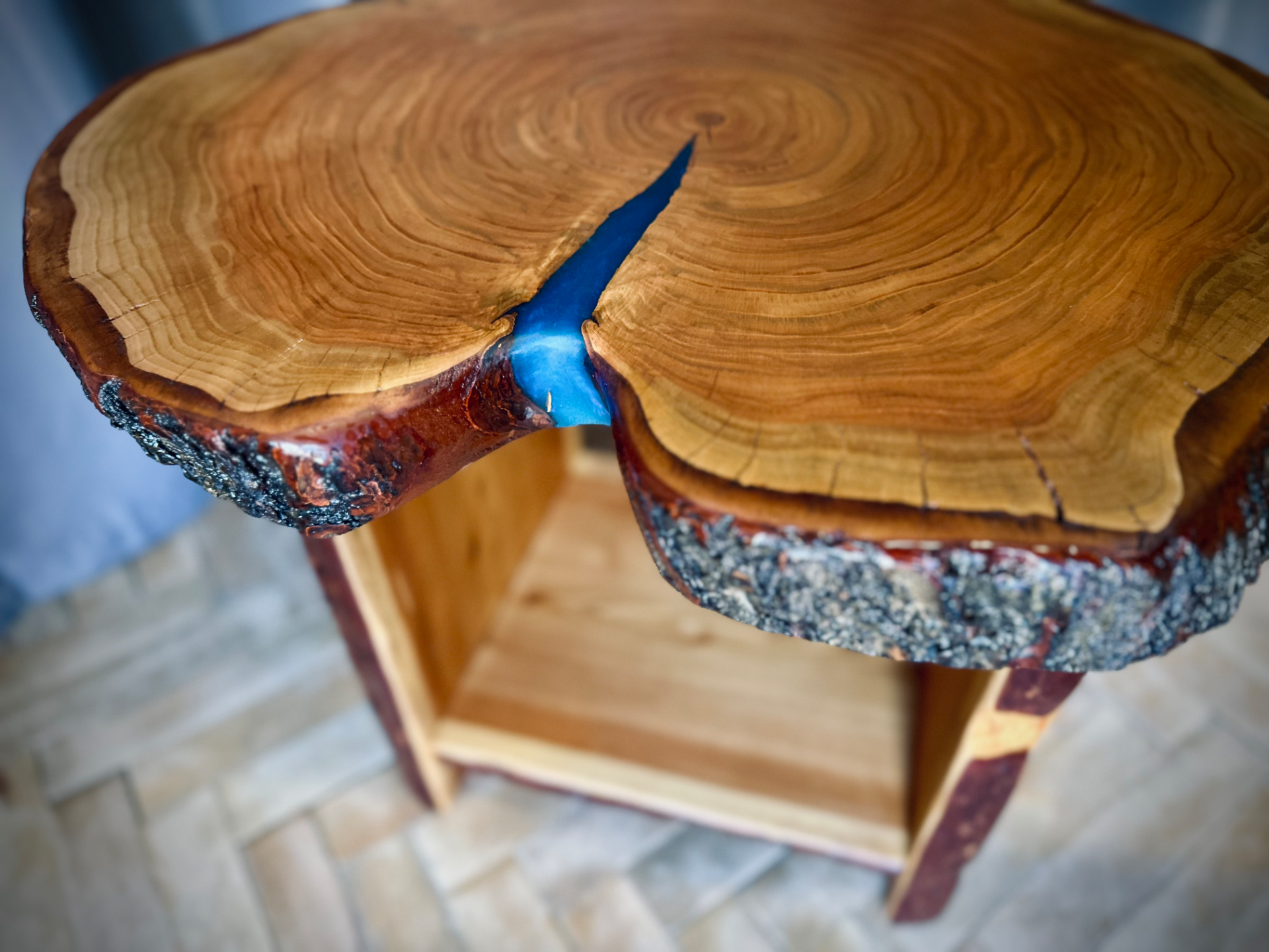 Prirodzená prasklina ktorá vznikla pri sušení je vyplnená modrou epoxidovou živicou. Celá stolová doska má zachovanú kôru s prírodnou hranou ktorá je dôkladne stabilizovaná epoxidom.