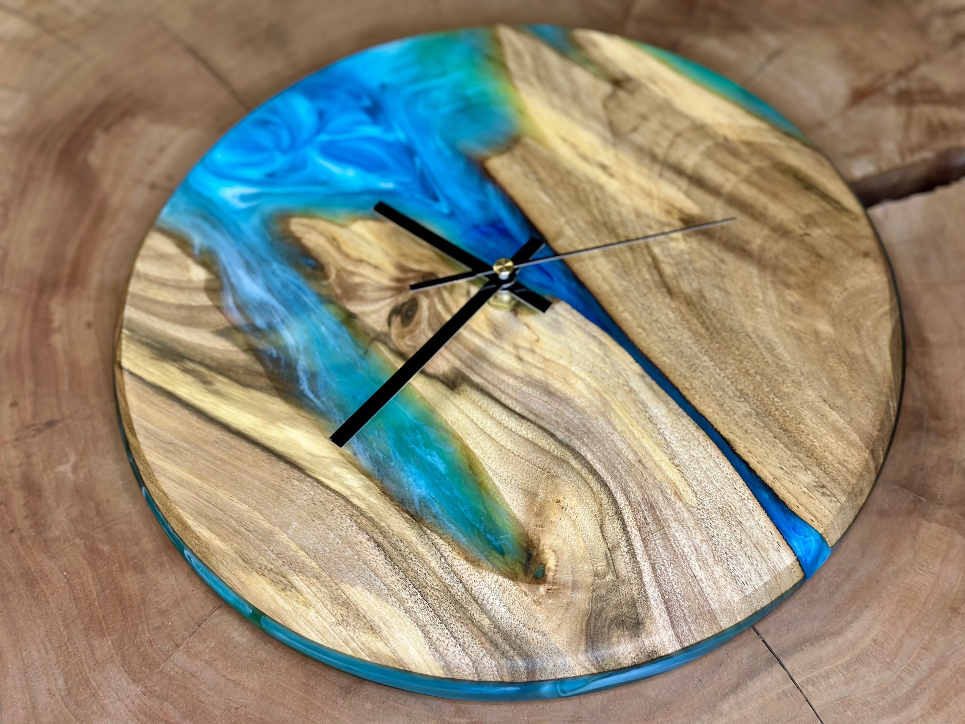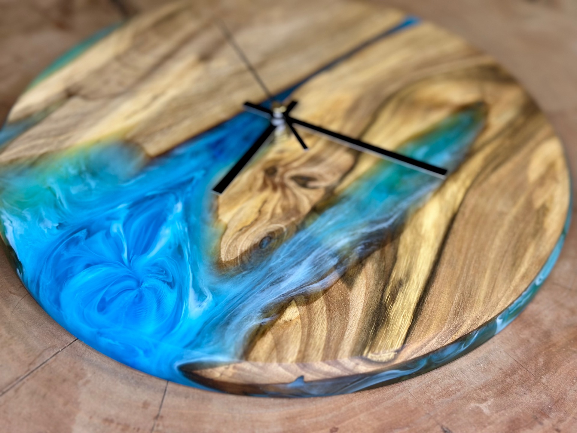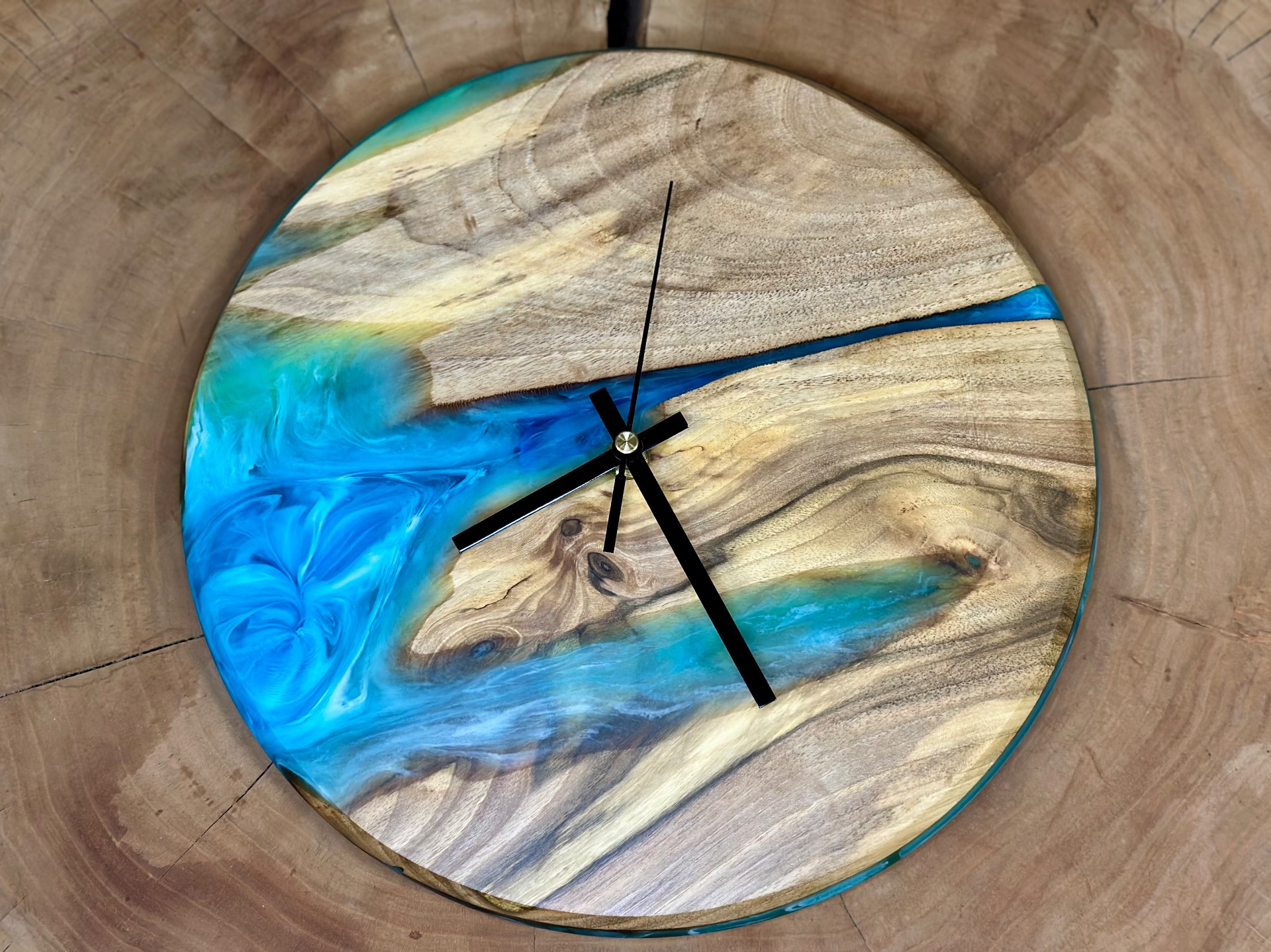 Nástenné hodiny z orechového dreva a tyrkysovej epoxidovej živice. Hodinový strojček s tichým a plynulým chodom.
