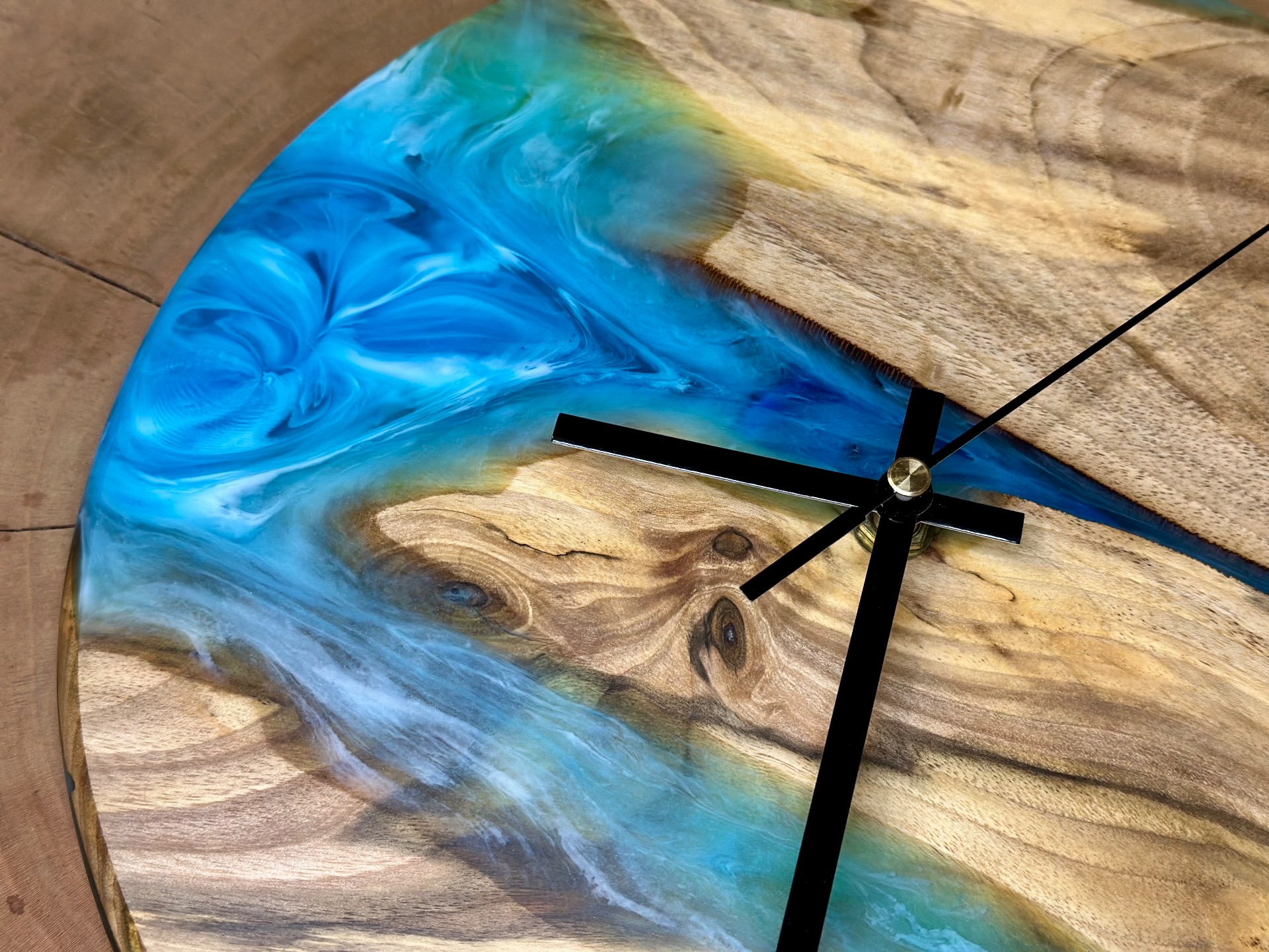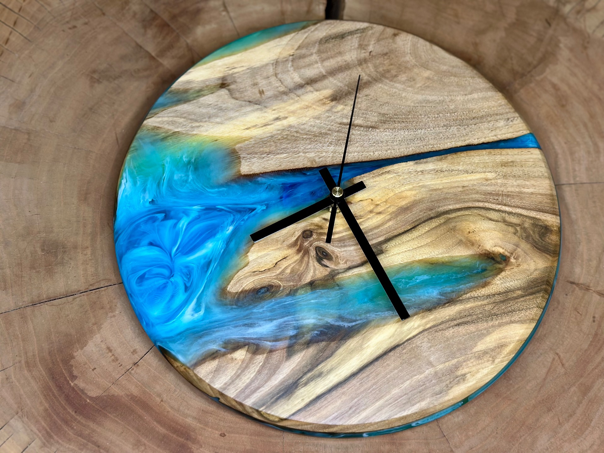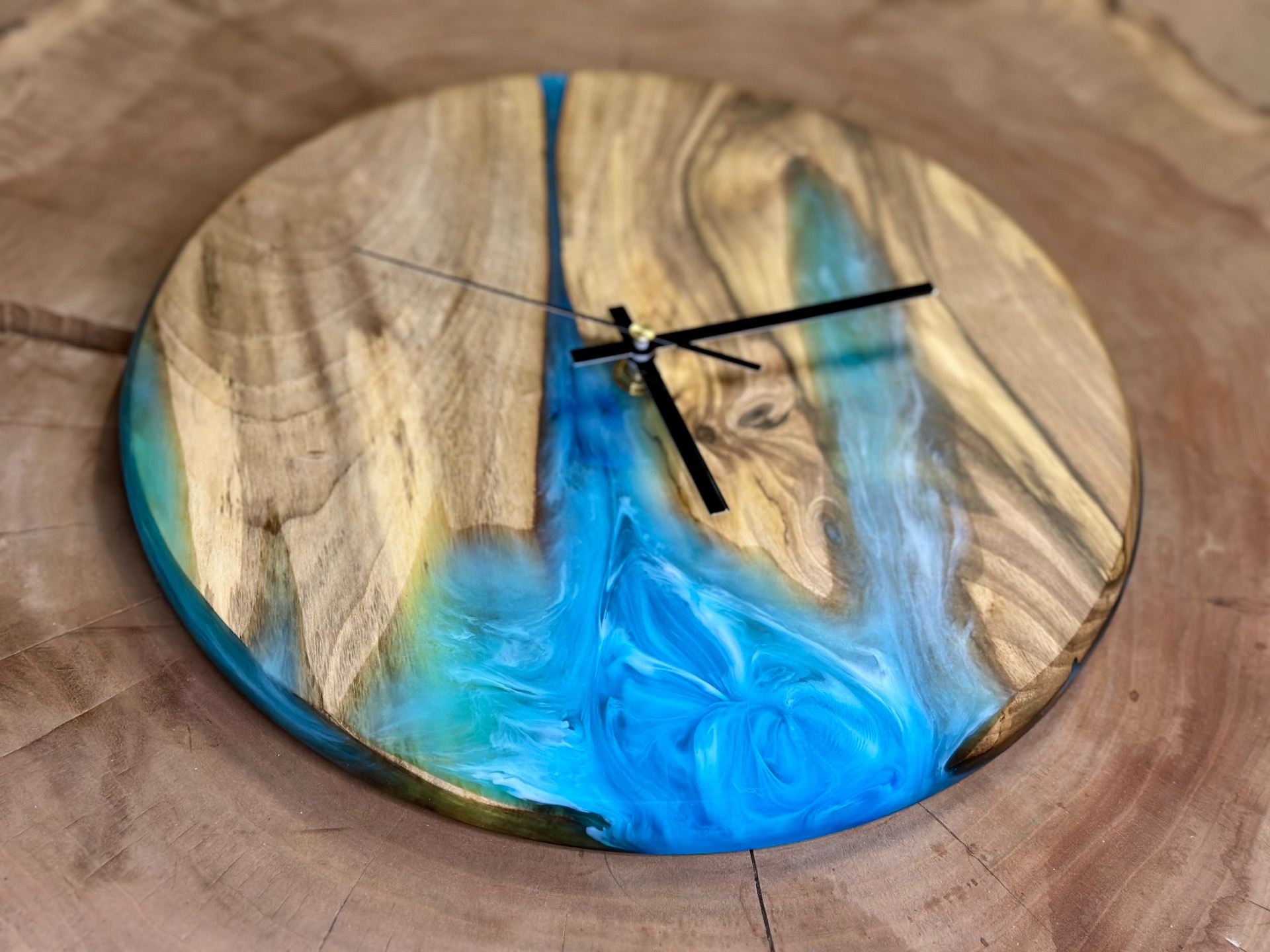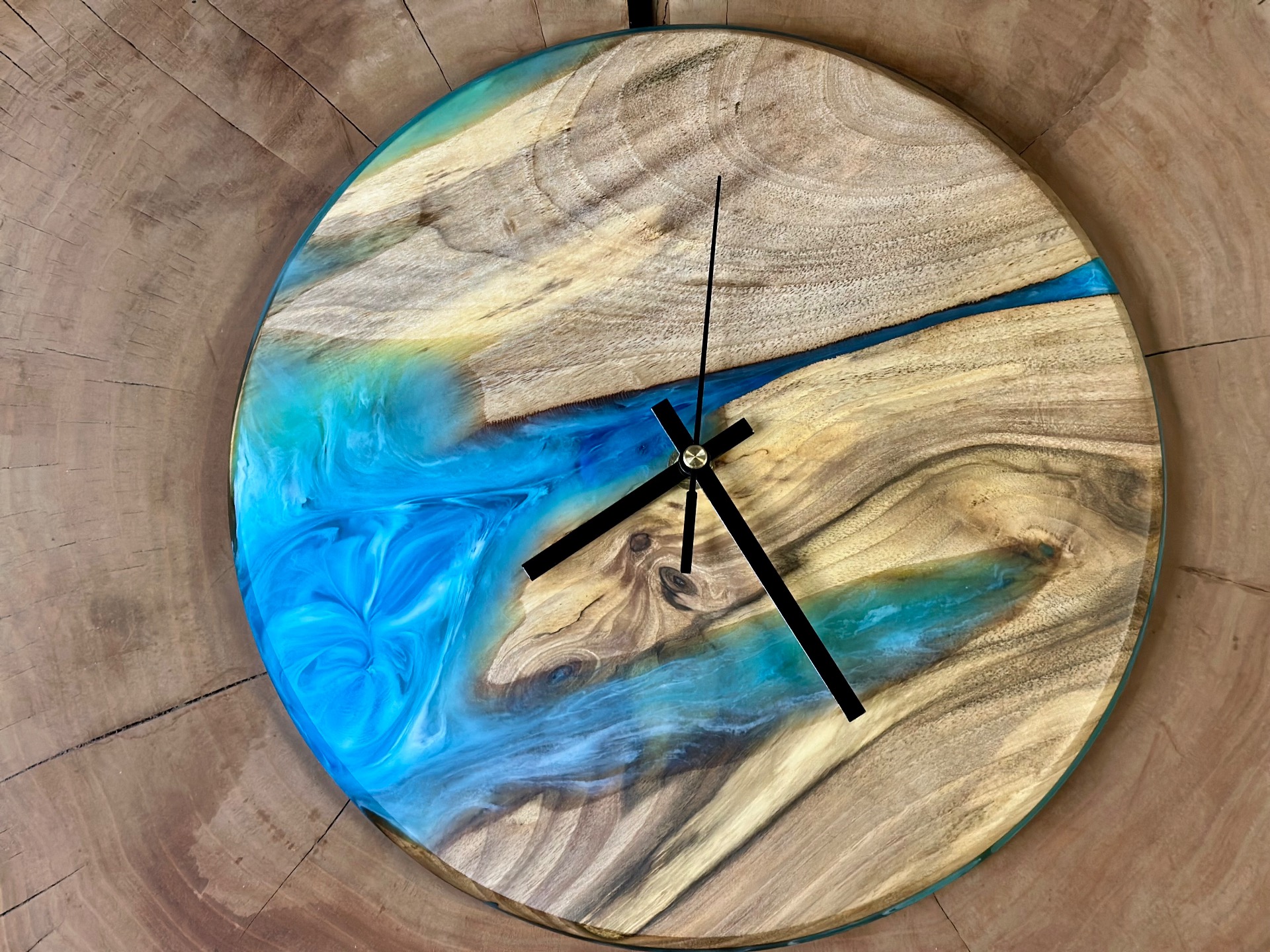 Nástenné hodiny z orechového dreva a tyrkysovej epoxidovej živice. Hodinový strojček s tichým a plynulým chodom.